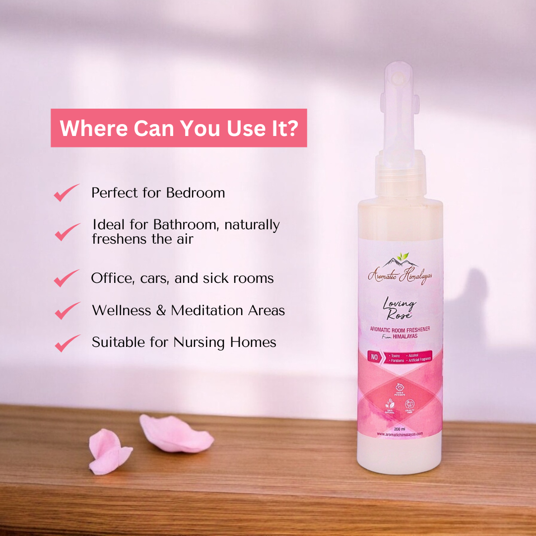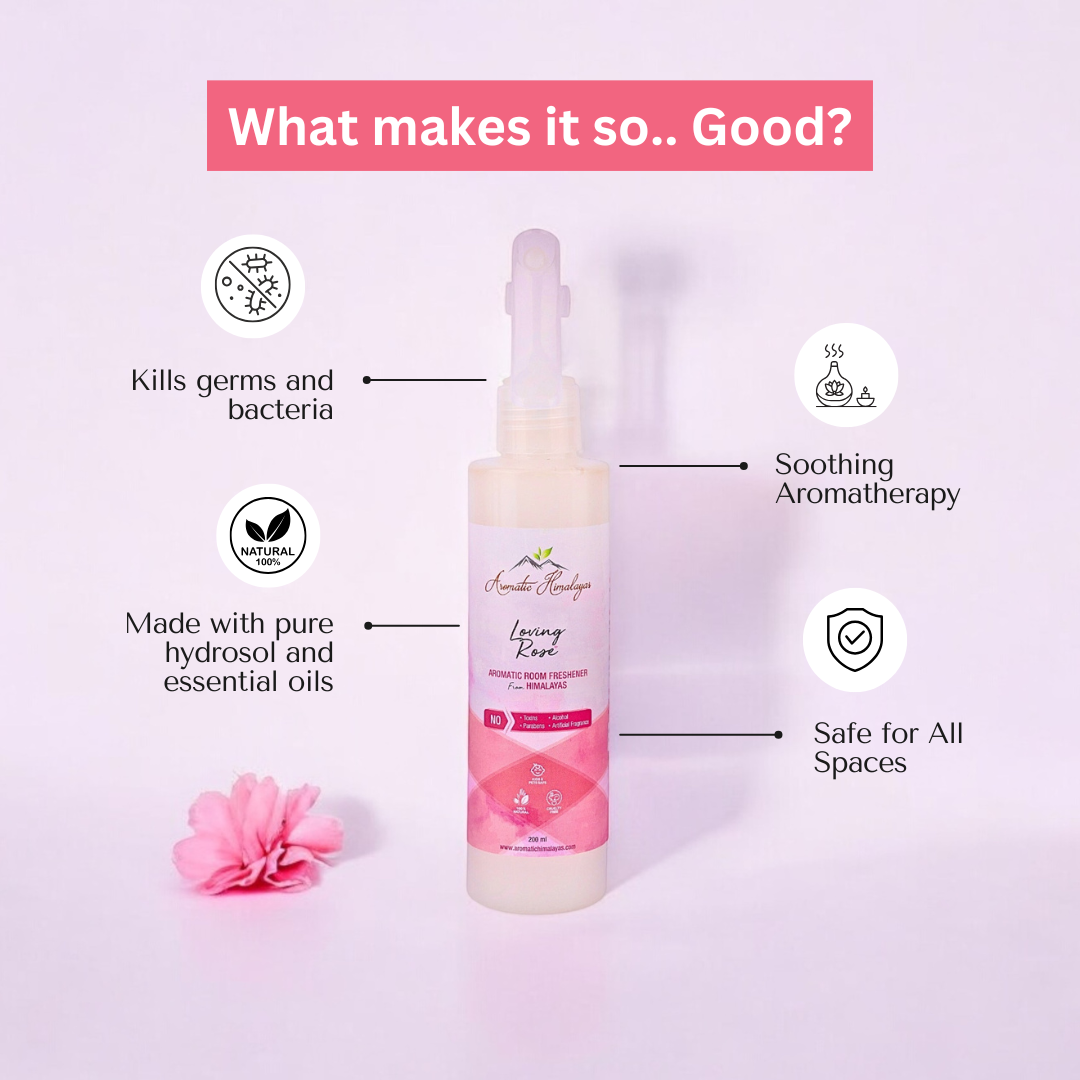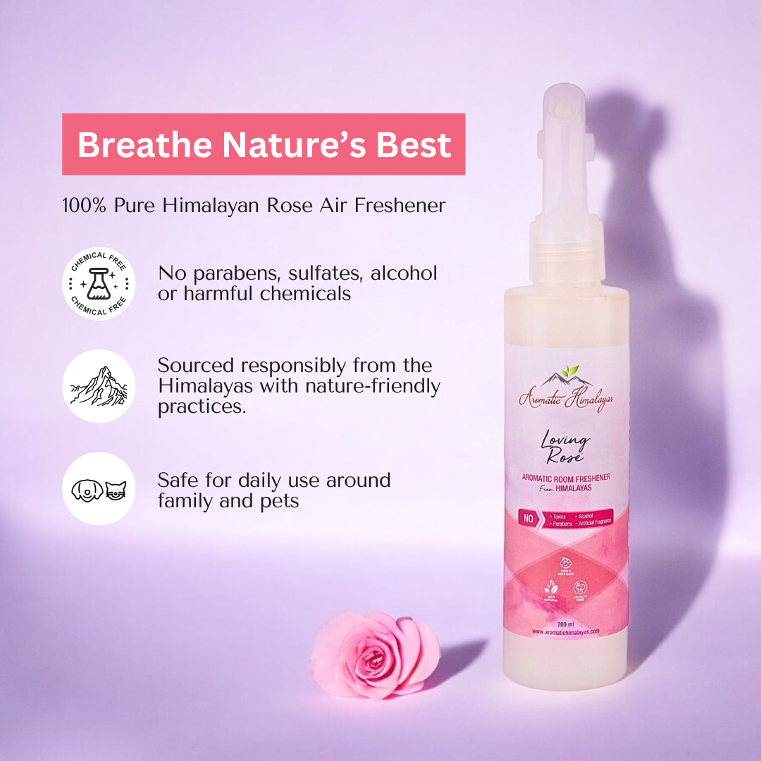 Immerse your living space in the romantic and soothing aroma of the Aromatic Himalayas- Loving Rose Room Freshener. Made from pure hydrosol and essential oils, this room freshener brings the enchanting essence of roses, straight from the Himalayas to your home. Elevate your home with the natural goodness of Mother Nature and breathe easier, knowing your air is free from harmful toxins and chemicals.