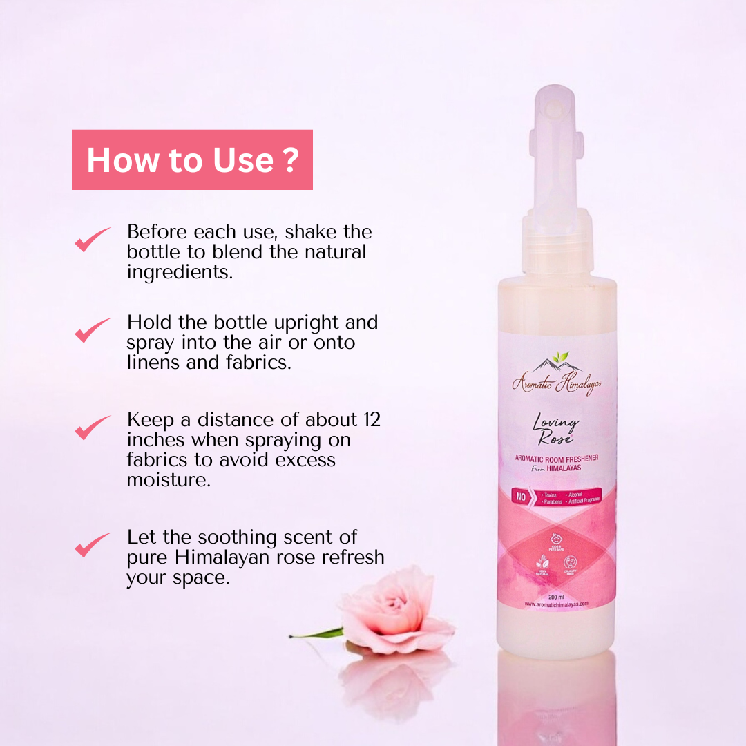 Directions for Use: Shake well before each use. Spray lightly into the air or onto linens and fabrics, maintaining a distance of about 12 inches. Enjoy the fresh, romantic aroma of roses while knowing you are breathing clean, pure air.