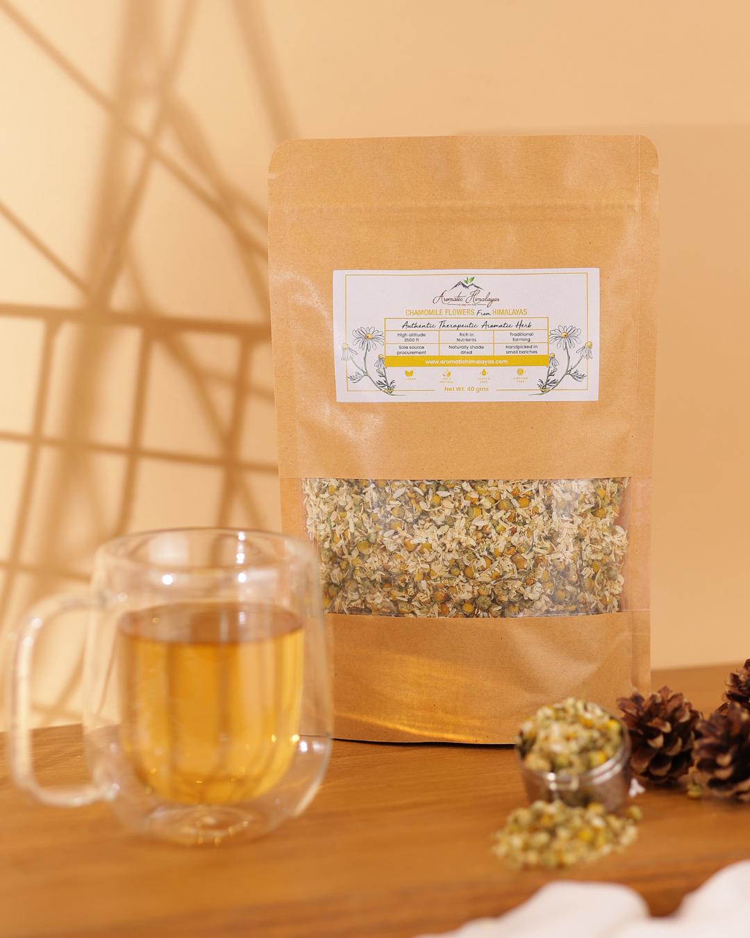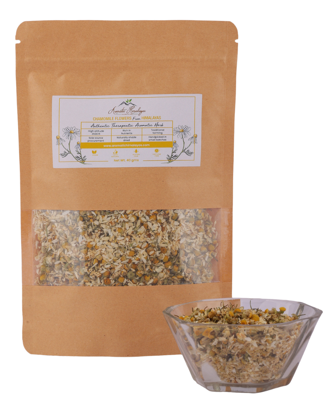 Aromatic Himalayas-Pure Chamomile Herb Tea- Chamomile Flowers from High altitude Western Himalayas- 3500ft -Herbal Tea – Caffeine Free | Calming Tisane | German Chamomile (Matricaria chamomilla L.) Species-40 gms- 20 cups -Indulge in the soothing essence of our premium Chamomile flowers sourced from the pristine Himalayan slopes. Our Himalayan Chamomile Flowers offer a calming escape from the chaos of everyday life, bringing the Himalayan tranquility directly to your cup.